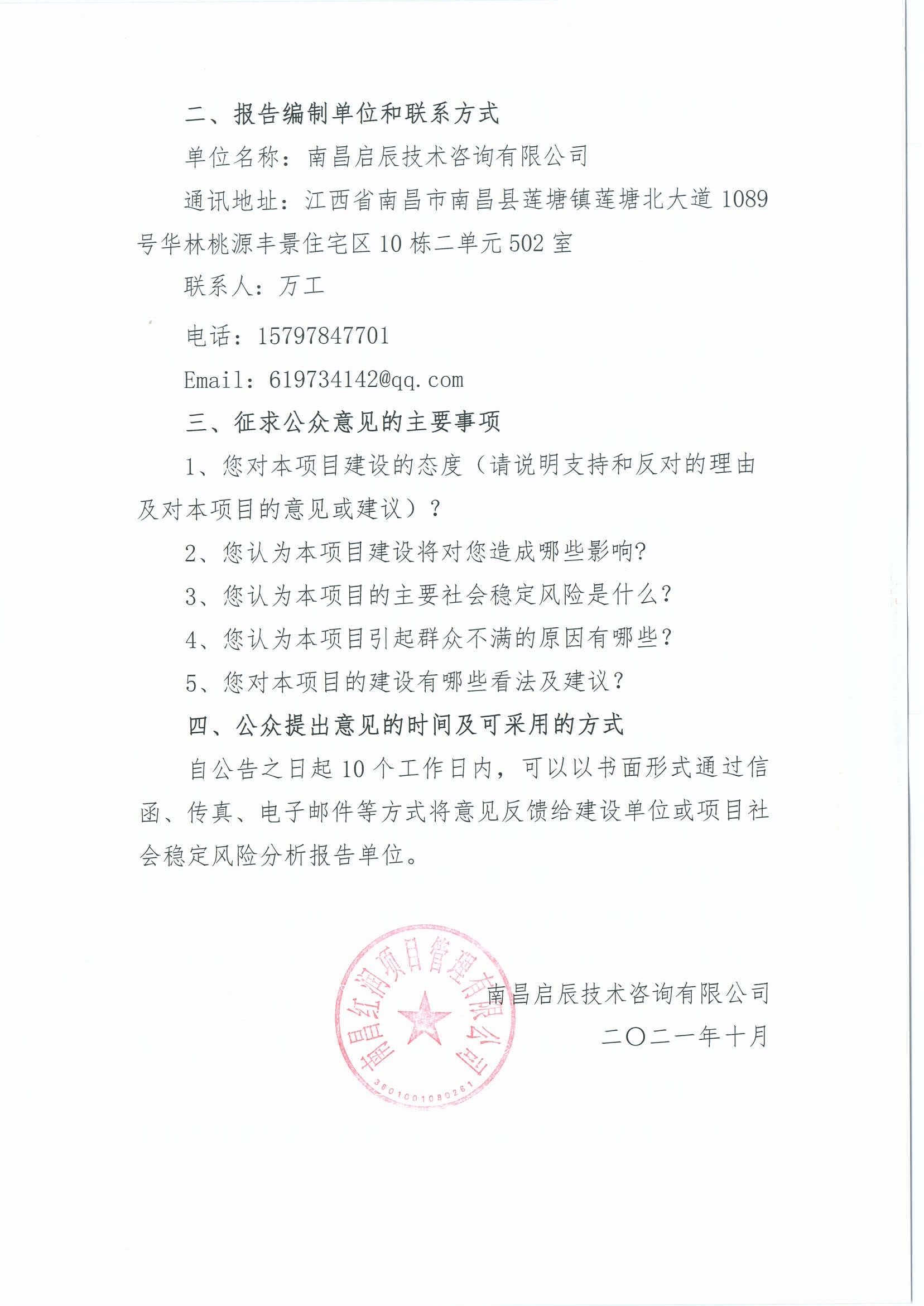 自公告之日起10個工作日內,可以以書面形式通過信函、傳真、電子郵件等方式將意見反饋給建設單位或項目社會穩(wěn)定風險分析報告單位。