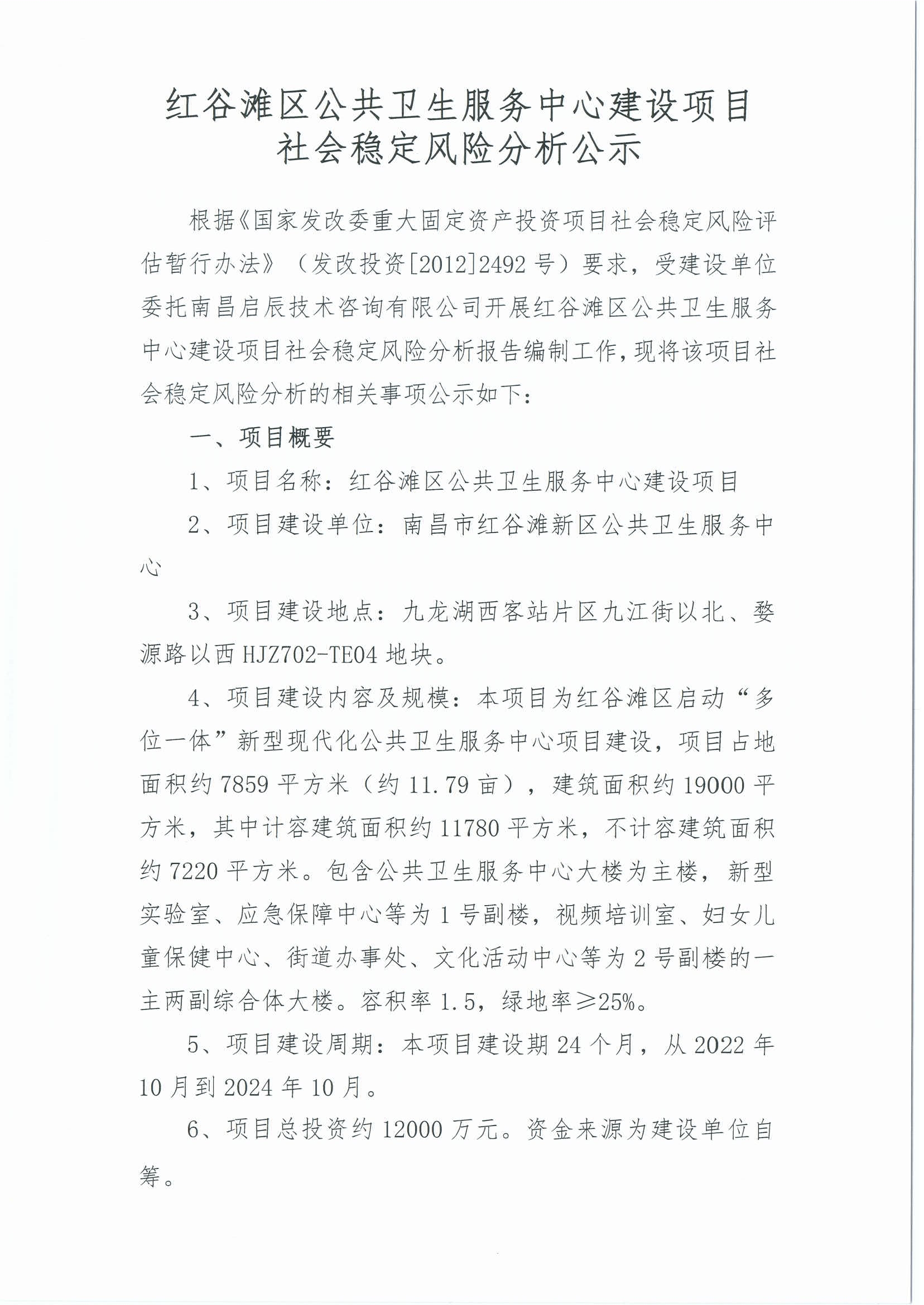 根據《國家發(fā)改委重大固定資產投資項目社會穩(wěn)定風險評估暫行辦法》(發(fā)改投資[2012]2492號)要求,受建設單位委托南昌啟辰技術咨詢有限公司開展紅谷灘區(qū)公共衛(wèi)生服務中心建設項目社會穩(wěn)定風險分析報告編制工作,現將該項目社會穩(wěn)定風險分析的相關事項公示如下: